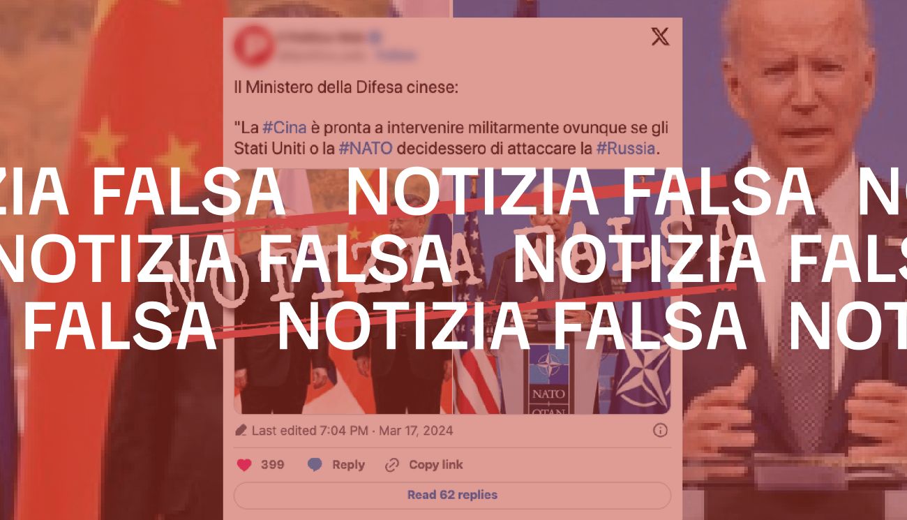 Il 17 marzo 2024 è stata pubblicato su X un post secondo il quale il ministero della Difesa cinese avrebbe dichiarato che «la #Cina è pronta a intervenire militarmente ovunque se gli Stati Uniti o la #NATO decidessero di attaccare la #Russia».