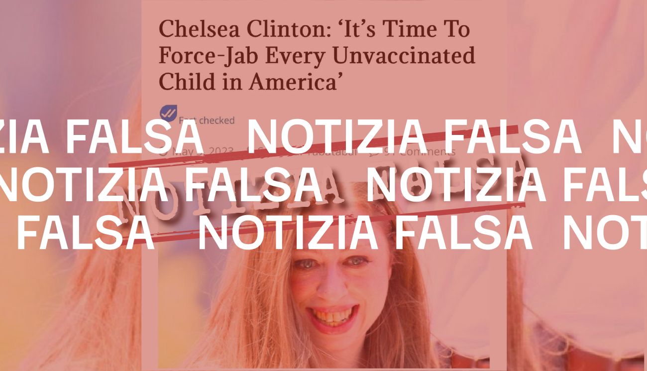 L’8 maggio 2023 è stato pubblicato su Facebook lo screenshot di un articolo intitolato “Chelsea Clinton: it’s time to force-jab every unvaccinated child in america” (in italiano: “Chelsea Clinton: è ora di vaccinare forzatamente ogni bambino non vaccinato in America”).