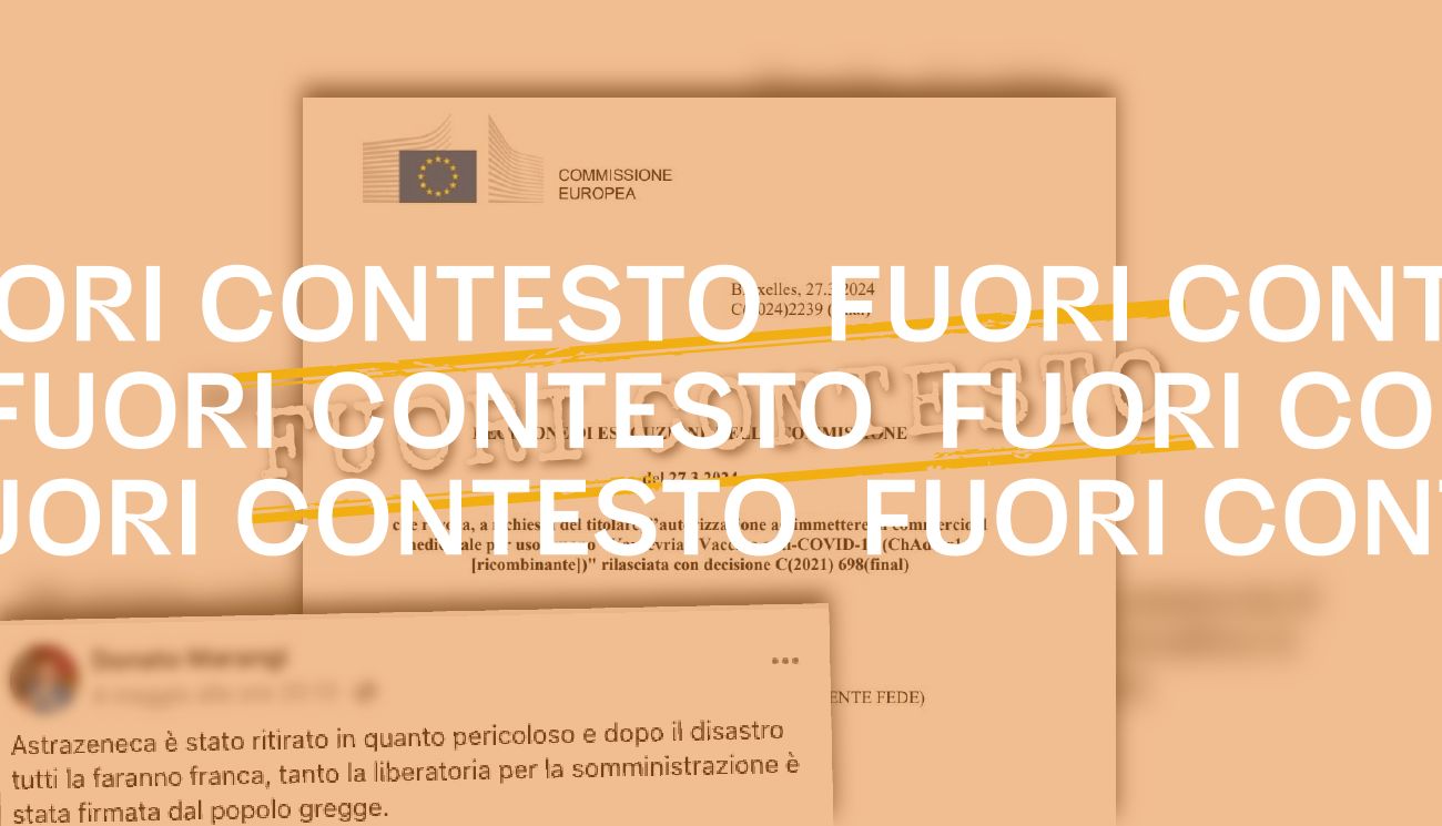 Il 4 maggio 2024 è stato pubblicato su Facebook lo screenshot di una presunta decisione della Commissione europea del 27 marzo 2024 in cui si legge della revoca, su richiesta di Astrazeneca, dell’autorizzazione «ad immettere in commercio il medicinale per uso umano “Vaxzevria – Vaccino anti-COVID-19» rilasciata nel 2021.
