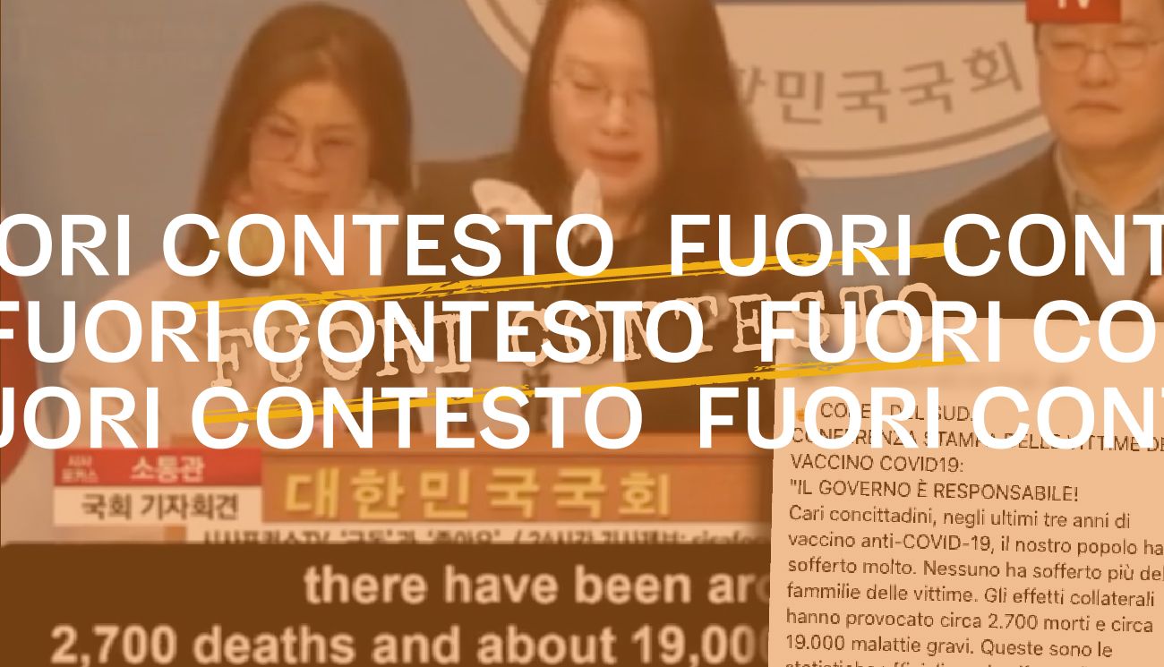 Il 25 marzo 2024 è stato pubblicato un video su Facebook in cui una donna e un uomo asiatici parlano durante quello che sembra una conferenza stampa. Secondo i sottotitoli in inglese presenti nel filmato, la donna afferma che i vaccini anti-Covid, in base alle statistiche ufficiali, avrebbero provocato 2.700 morti e 19 mila reazioni avverse gravi. Successivamente, l’uomo, che si identifica come «Kim Doo-kyung, presidente dell’Associazione delle famiglie delle vittime dei vaccini», ripete gli stessi presunti dati citati dalla donna in precedenza, sostenendo che le vaccinazioni anti-Covid sarebbero state inefficaci.