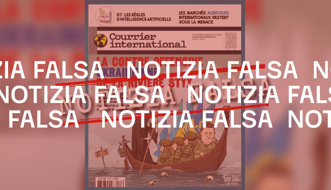 Il 24 maggio 2023 è stata pubblicata su Facebook l’immagine di una presunta copertina del numero 1700 di maggio 2023 del settimanale francese Courrier International. Nell’immagine si vede un disegno del presidente ucraino Volodymyr Zelensky che insieme a soldati ucraini viene trasportato a bordo di un barca attraverso lo Stige, fiume immaginario che secondo la mitologia greca conduceva agli Inferi, da una figura con indosso mantello e cappuccio neri.