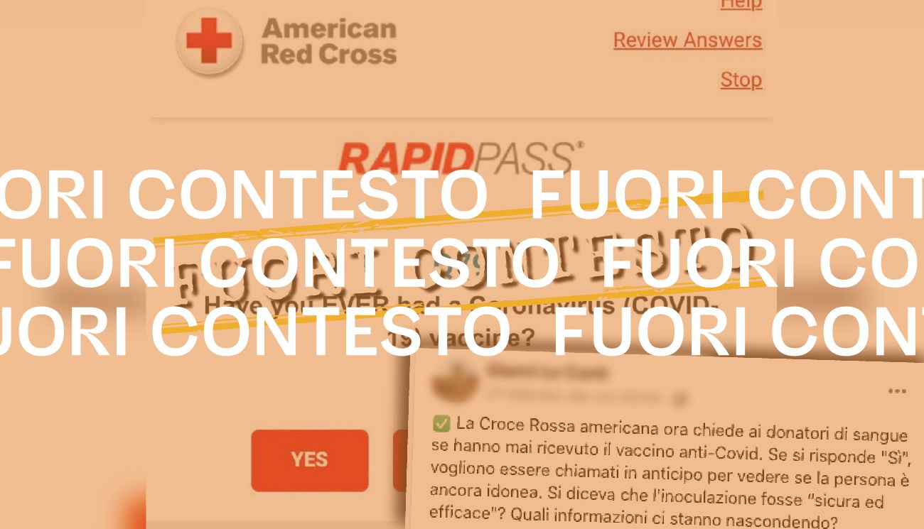 Il 21 febbraio 2024 è stata pubblicata su Facebook l’immagine di un presunto avviso in inglese della Croce rossa statunitense, contenente la richiesta di rispondere «sì» o «no» alla domanda «Hai mai fatto un vaccino contro il Coronavirus (COVID-19)?». Nel testo compare anche una nota in cui si legge «Se rispondi “SI” a questa domanda, chiama il numero 1-800-RED CROSS (1-800-733-2767) prima di venire a donare per determinare se ciò influirà sulla tua idoneità nel farlo».