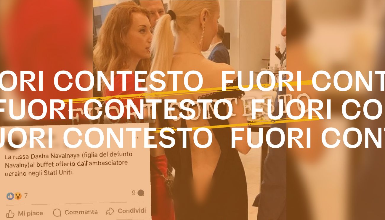 Il 10 aprile 2024 è stata pubblicata su Facebook una foto che mostra una donna bionda di spalle che indossa un abito nero lungo da sera, con una lunga scollatura sulla schiena che mostra una parte di sedere. La scena sembra svolgersi durante un evento mondano all’interno di una grande stanza. L’immagine è accompagnata da questo commento, scritto dall’autore del post: «La russa Dasha Navalnaya (figlia del defunto Navalny) al buffet offerto dall’ambasciatore ucraino negli Stati Uniti». Lo stesso contenuto è stato diffuso su X.