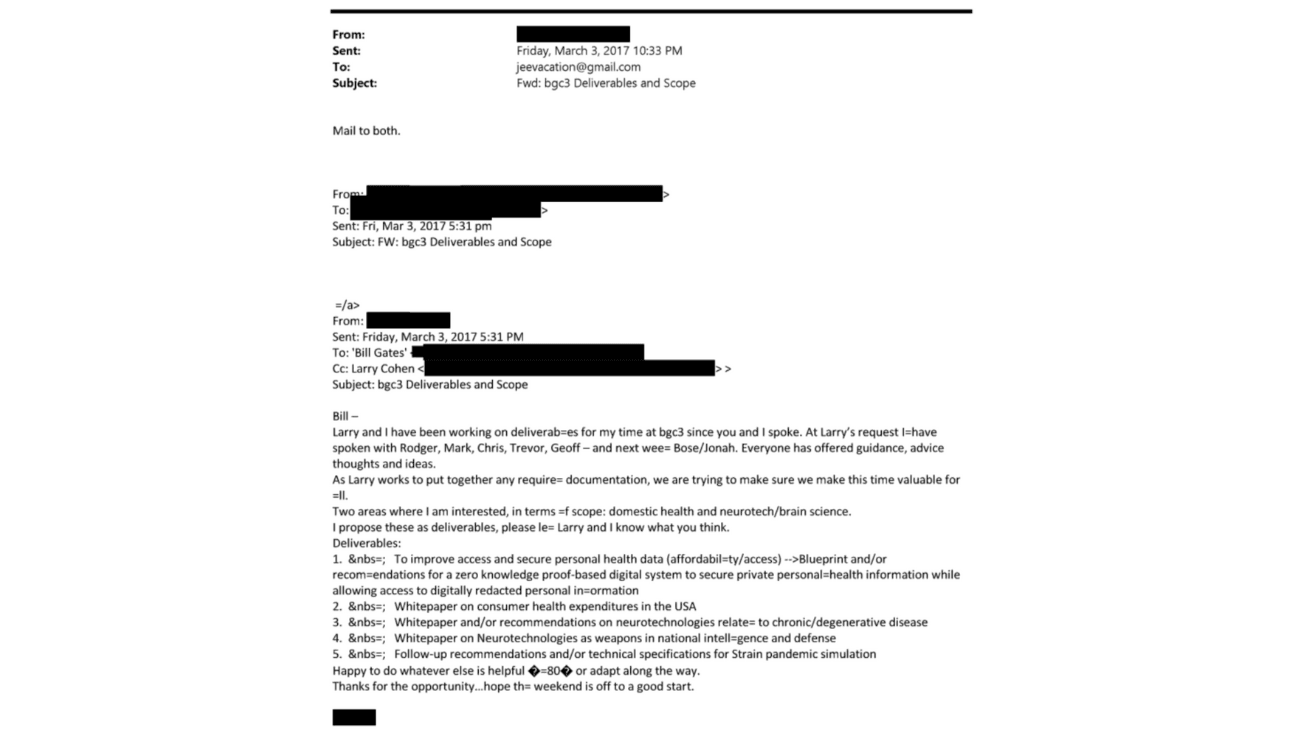 Nella mail vengono elencati una serie di progetti per l’allora bgC3: migliorare l’accesso e proteggere i dati sanitari personali, redigere un documento che analizzi la spesa sanitaria dei consumatori negli Stati Uniti, sviluppare raccomandazioni sulle neurotecnologie relative le malattie croniche/degenerative, scrivere un report sulle neurotecnologie come armi nell’intelligence e nella difesa nazionale e infine «fornire raccomandazioni di follow-up e/o specifiche tecniche per la simulazione di un nuovo ceppo pandemico».