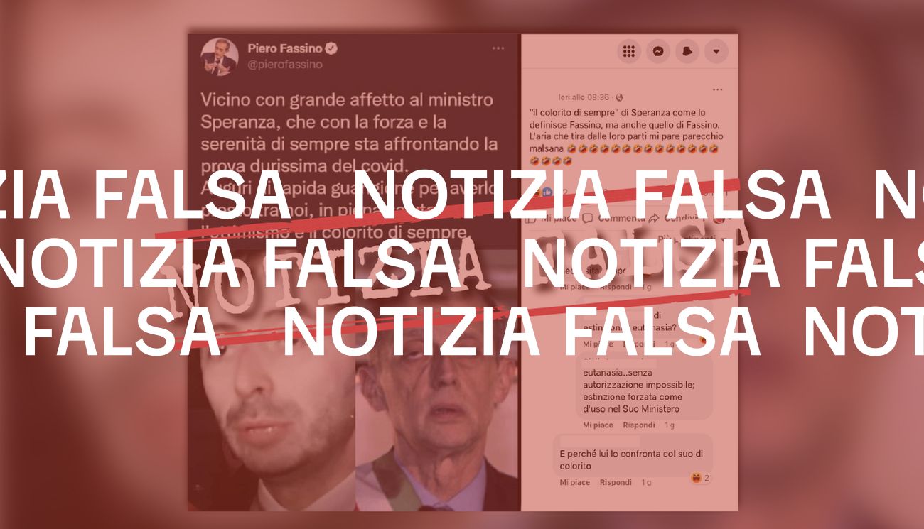Il 16 giugno 2022 su Facebook è stato pubblicato lo screenshot di un tweet che sarebbe stato pubblicato dall’esponente del Partito Democratico Piero Fassino. Si legge: «Vicino con grande affetto al ministro Speranza, che con la forza e la serenità di sempre sta affrontando la prova durissima del covid. Auguri di rapida guarigione per averlo presto tra noi, in piena salute, con l’ottimismo e il colorito di sempre». Oltre al testo, il post mostra anche i volti visibilmente pallidi di Fassino e di Speranza.