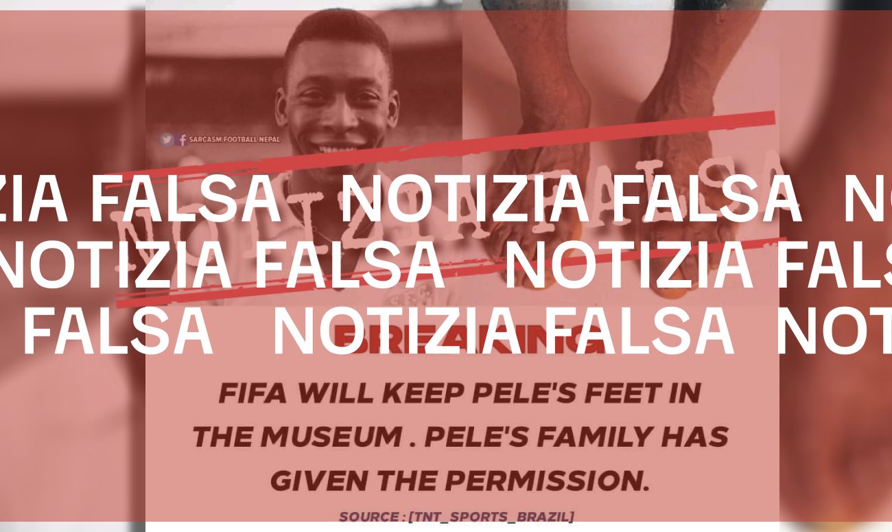 Sulla foto è presente un testo in lingua inglese in cui si legge che la Fédération Internationale de Football Association (Fifa) esporrà i piedi di Pelé nel suo museo a Zurigo e che la famiglia ha già dato il permesso. La fonte della notizia sarebbe «TNT_SPORTS_BRAZIL».