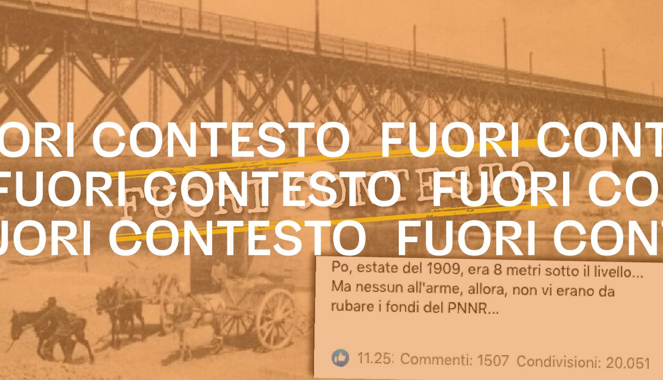 L’8 agosto 2022 la redazione di Facta ha ricevuto una segnalazione che chiedeva di verificare le informazioni contenute in un post pubblicato su Facebook il 18 luglio, contenente una foto in bianco e nero del fiume Po nel tratto piacentino che scorre sotto il ponte Nuovo. L’immagine è accompagnata da un testo, scritto dall’autore del post, in cui si legge: «Po, estate del 1909, era 8 metri sotto il livello… Ma nessun all’arme, allora, non vi erano da rubare i fondi del PNNR…».