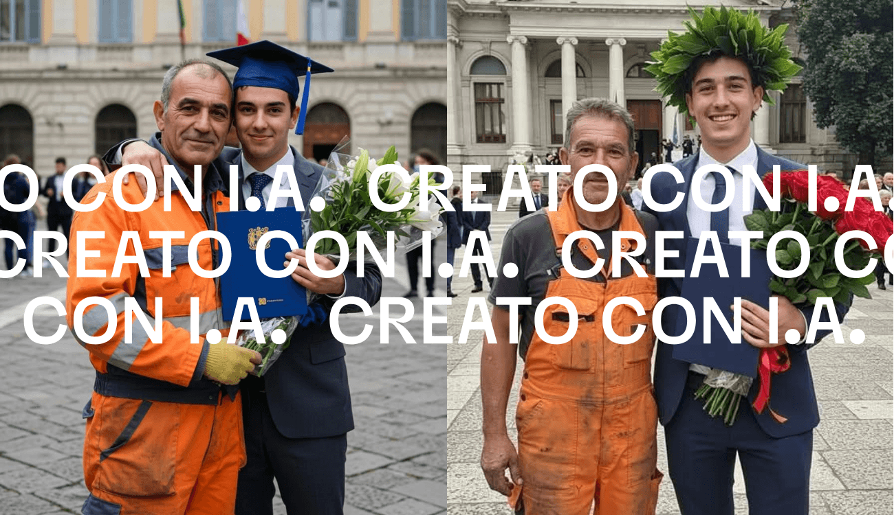 Sulla stessa piattaforma si trovano altre immagini molto simili, sempre generate con l’IA, di padri con divise da lavoro catalinfrangenti alla laurea dei figli, accompagnate da didascalie pressoché identiche.