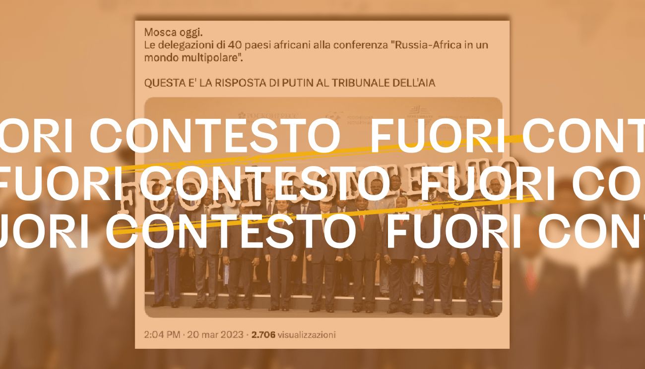Il 20 marzo 2023 è stato pubblicato un tweet con una foto che mostra il presidente russo Vladimir Putin in posa insieme ad altri 27 uomini, tra cui si riconosce anche il presidente egiziano al-Sisi, in quello che appare un evento ufficiale. L’immagine è accompagnata da un testo che recita: «Mosca oggi. Le delegazioni di 40 paesi africani alla conferenza “Russia-Africa in un mondo multipolare”. QUESTA E’ LA RISPOSTA DI PUTIN AL TRIBUNALE DELL’AIA».