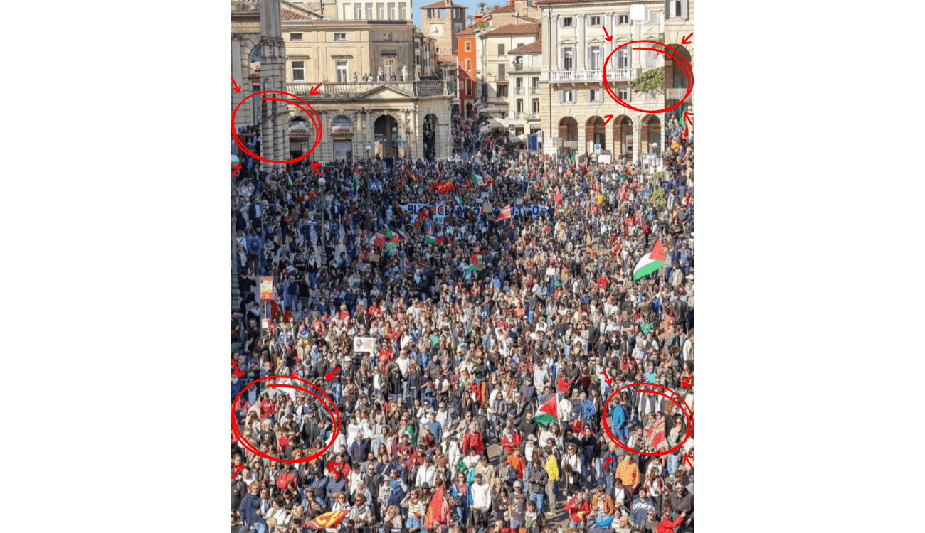 Il 5 ottobre 2025 su X è stata pubblicata la foto di una piazza piena di persone per una manifestazione, la cui didascalia in sovrimpressione recita: «Sui quotidiani piazza pro pal a Verona, foto fake!». Sull’immagine vengono fatte notare la presenza di alcune presunte incongruenze che dimostrerebbero che la foto è stata manipolata e quindi è falsa. Chi ha condiviso l’immagine, ha scritto: «Io sono di Verona e tutte quelle persone se le sognano!».