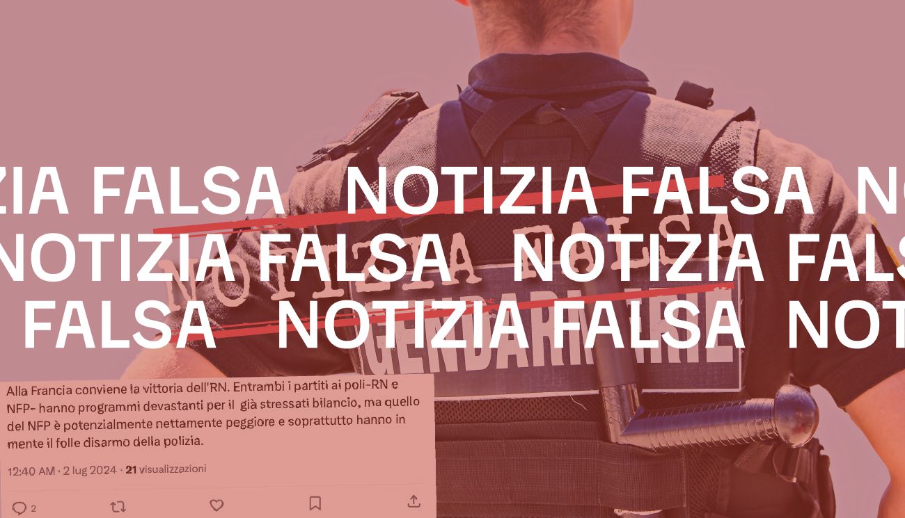 Il 1° luglio 2024 l’account X di Quarta Repubblica, trasmissione televisiva in onda su Rete4, ha pubblicato la foto di uno spezzone della propria puntata andata in onda (minuto 00:20:31) la sera stessa in cui viene presentato il «programma del Front Populaire», la coalizione dei partiti francesi di sinistra nata in vista delle elezioni legislative convocate dal presidente Emmanuel Macron per il 30 giugno e il 7 luglio 2024. Secondo quanto trasmesso da Quarta Repubblica, il programma del Front Populaire prevede, tra le altre cose, il «disarmo (parziale)» della polizia.