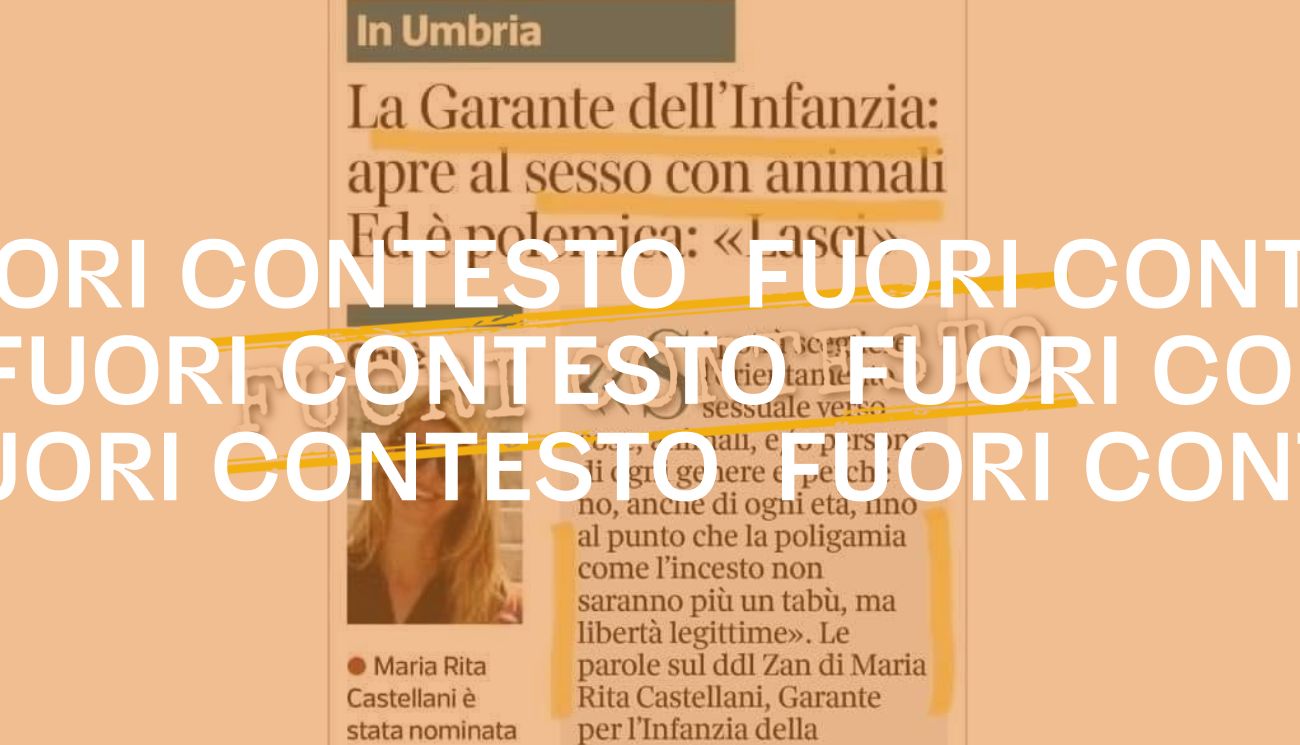 Come si evince dall’editoriale stesso, tale dichiarazione è una deduzione iperbolica tratta dal punto d dell’art. 1 del ddl Zan, che recita: «Per identità di genere si intende l’identificazione percepita e manifestata di sé in relazione al genere, anche se non corrispondente al sesso, indipendentemente dall’aver concluso un percorso di transizione». Secondo la Garante, come riportato da Umbria24, questo sarebbe un riferimento alla presunta volontà di «rendere tutti “fluidi” e non più distinguibili, tra maschio, femmina e altre “58 identità distinte”». Quindi, la Garante dell’infanzia Maria Rita Castellani non legittima il «sesso con animali», ma nel 2021, con quell’espressione, aveva criticato il DDL Zan.