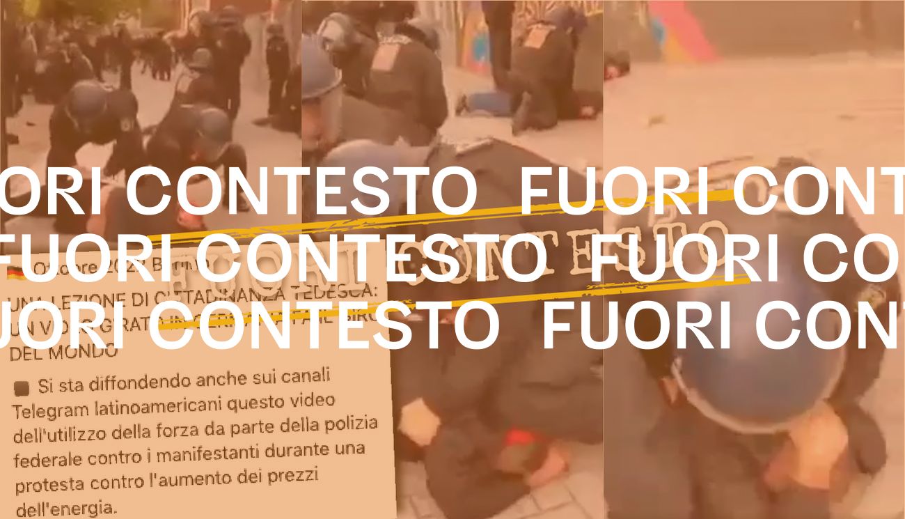 Il 22 ottobre 2022 su Facebook è stato pubblicato un video che ritrae un agente, durante un’azione di polizia, immobilizzare un uomo a terra e colpirlo più volte con pugni e gomitate. Le immagini sono accompagnate da un testo in cui si afferma che la scena si sarebbe svolta a ottobre 2022 a Berlino, in Germania, e che mostrerebbe «l’utilizzo della forza da parte della polizia federale contro i manifestanti durante una protesta contro l’aumento dei prezzi dell’energia».