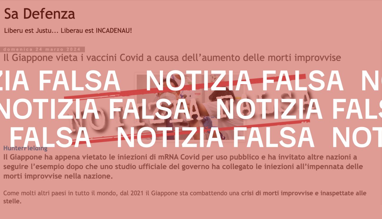 Il 28 marzo 2024 la redazione di Facta ha ricevuto una segnalazione via WhatsApp che chiedeva di verificare un articolo del blog Sa Defenza, pubblicato quattro giorni prima e intitolato “Il Giappone vieta i vaccini Covid a causa dell’aumento delle morti improvvise”. Nell’articolo si legge che «il Giappone ha appena vietato le iniezioni di mRNA Covid per uso pubblico e ha invitato altre nazioni a seguire l’esempio dopo che uno studio ufficiale del governo ha collegato le iniezioni all’impennata delle morti improvvise nella nazione».
