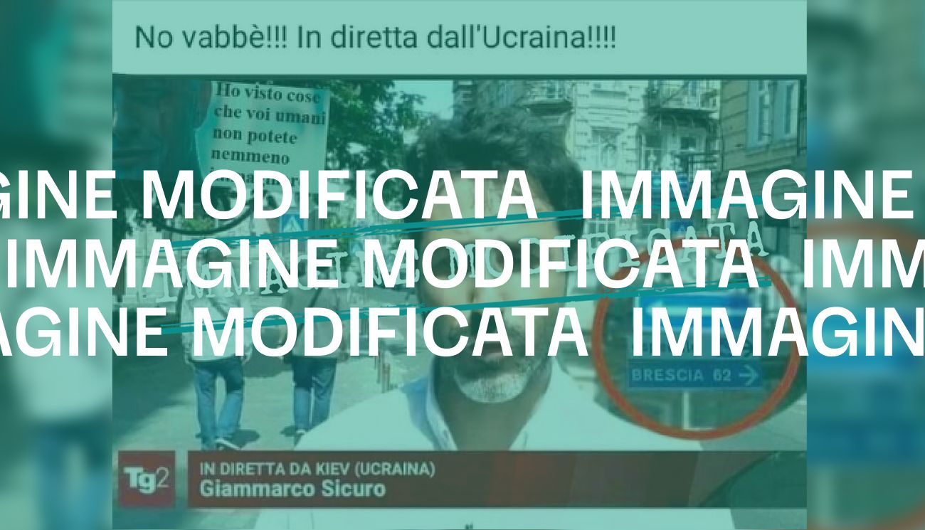 Il 29 maggio 2023 è stata pubblicata su Facebook la foto di un giornalista in collegamento da una strada di città. In sovraimpressione si legge la scritta «TG2 In diretta da Kiev (Ucraina)» e il nome del giornalista, Giammarco Sicuro. Nell’immagine, sulla destra del giornalista, si vedono però indicato in un cerchio rosso l’ingrandimento di due cartelli stradali in italiano: «Ospedale» e «Brescia 62».