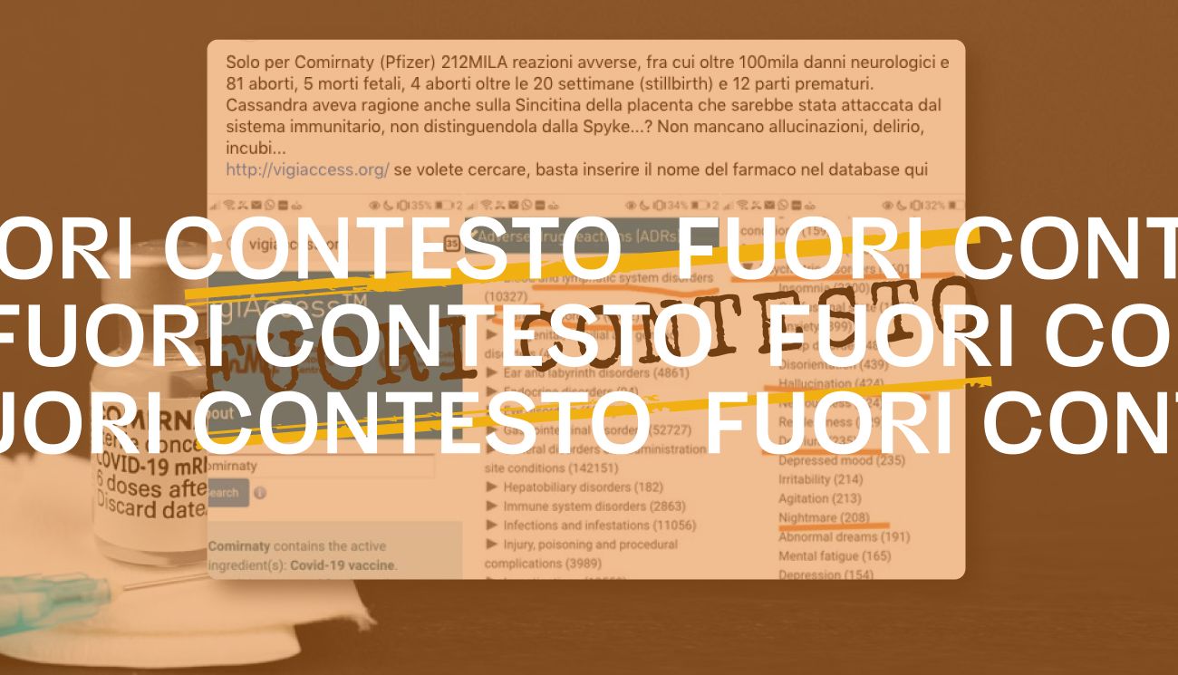 Il 10 marzo 2021 è stato pubblicato su Facebook un post contenente tre screenshot tratti da VigiAccess, un database dedicato alla raccolta di «sospetti effetti collaterali di diversi prodotti medicinali» gestito dall’Uppsala Monitoring Centre (centro di ricerca indipendente sulla sicurezza dei medicinali con sede in Svezia) in collaborazione con l’Organizzazione mondiale della sanità.