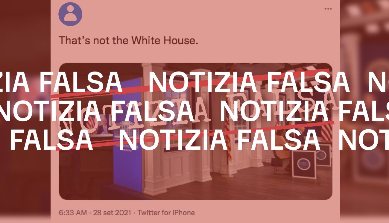 La foto oggetto della nostra verifica ritrae il presidente degli Stati Uniti di fronte a tre finte finestre, dietro le quali si nascondono uno schermo televisivo e un collaboratore di Biden. Il tweet è accompagnato da un messaggio, scritto dal suo autore, in cui si legge: «Quella non è la Casa Bianca».