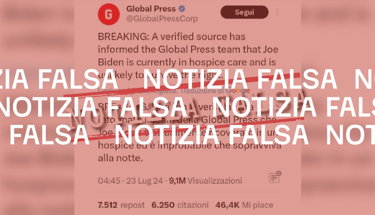 Il 23 luglio 2024 è stato pubblicato su Facebook lo screenshot di un presunto post su X diffuso dall’account «Global Press». Nel tweet si legge che «una fonte verificata» avrebbe «informato il team della Global Press che Joe Biden è attualmente ricoverato in un hospice ed è improbabile che sopravviva alla notte».