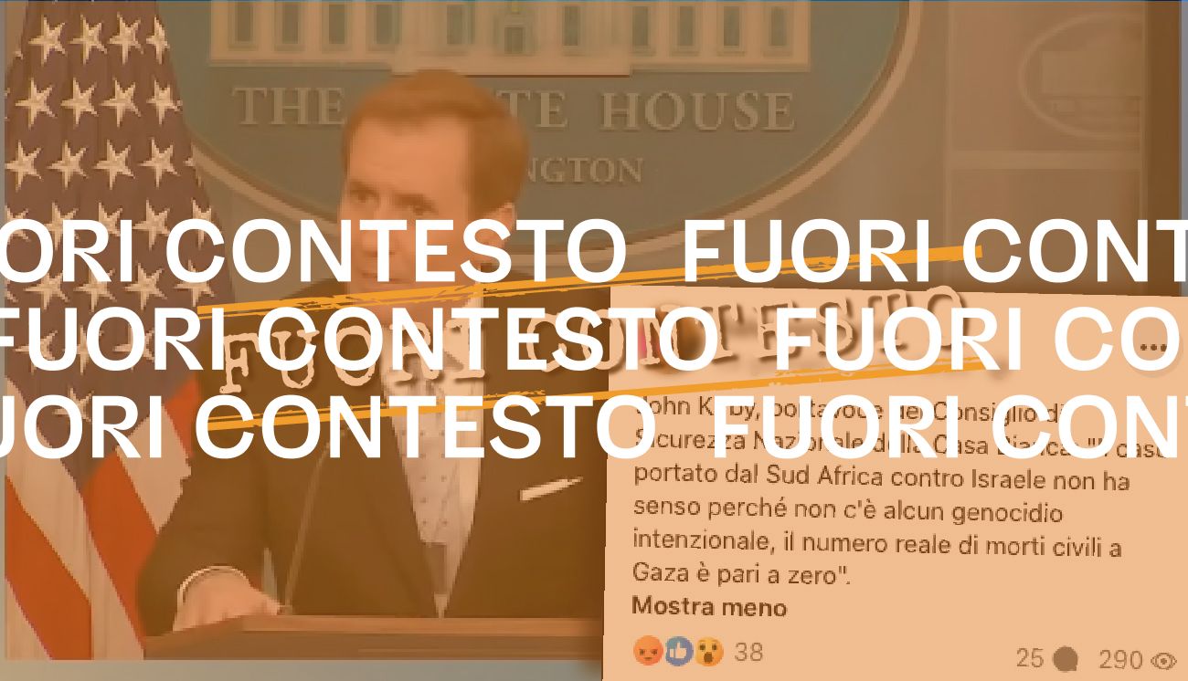 Il 28 gennaio 2024 è stato pubblicato un post su Facebook in cui si legge che «John Kirby, portavoce del Consiglio di Sicurezza Nazionale della Casa Bianca», avrebbe dichiarato: «Il caso portato dal Sud Africa contro Israele non ha senso perché non c’è alcun genocidio intenzionale, il numero reale di morti civili a Gaza è pari a zero». Nel post è presente anche un breve video che mostra Kirby durante una conferenza stampa e che confermerebbe che il portavoce della Casa Bianca avrebbe detto la frase sopra riportata.