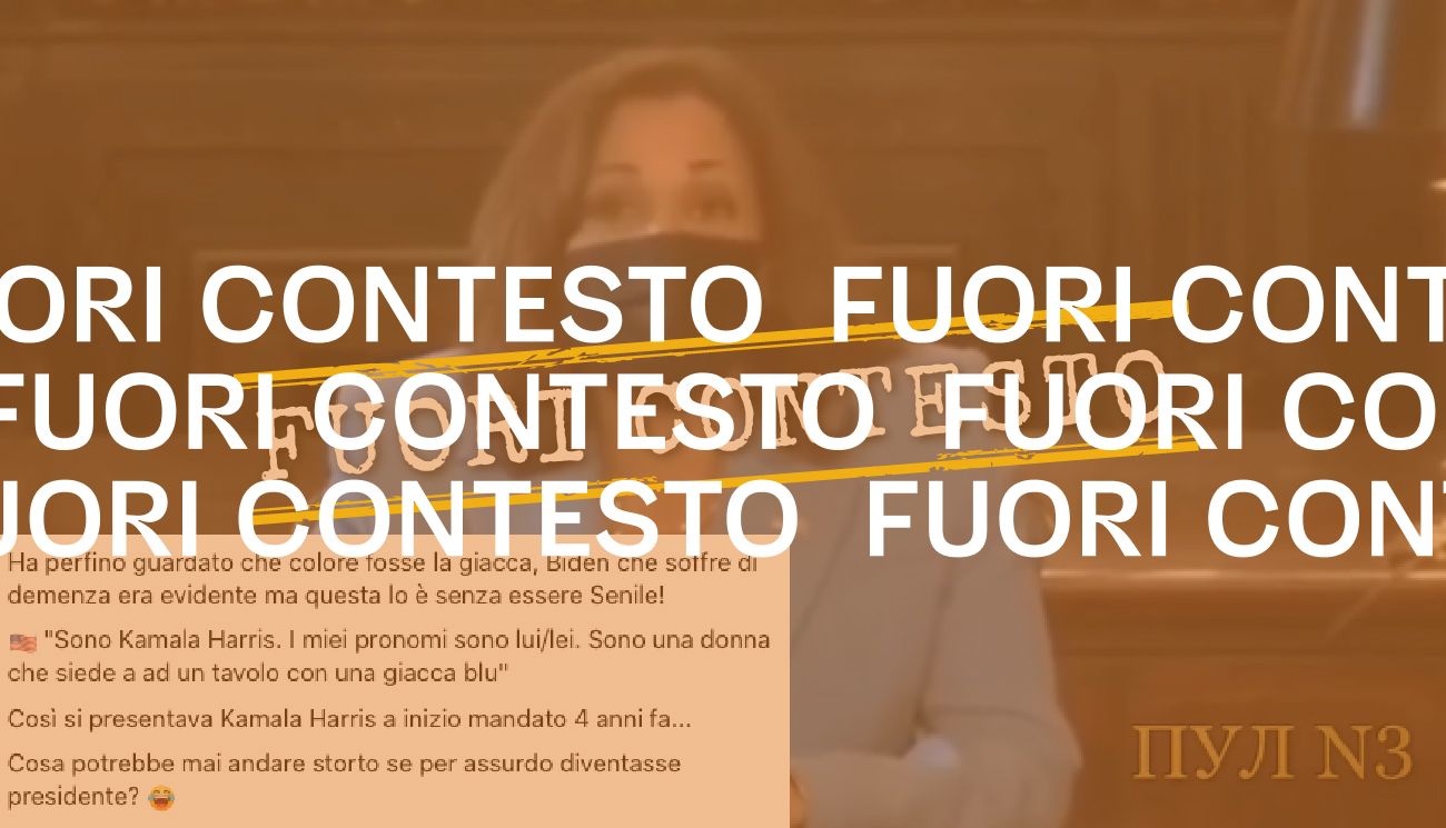 Il 22 luglio 2024 su Facebook è stato pubblicato un video in cui si vede Kamala Harris, seduta a un tavolo con alcune persone, indossare una giacca blu e parlare in inglese con una mascherina sul volto. Secondo chi ha condiviso il filmato, la vicepresidente degli Stati Uniti avrebbe detto: «Sono Kamala Harris. I miei pronomi sono lui/lei. Sono una donna che siede a un tavolo con una giacca blu».