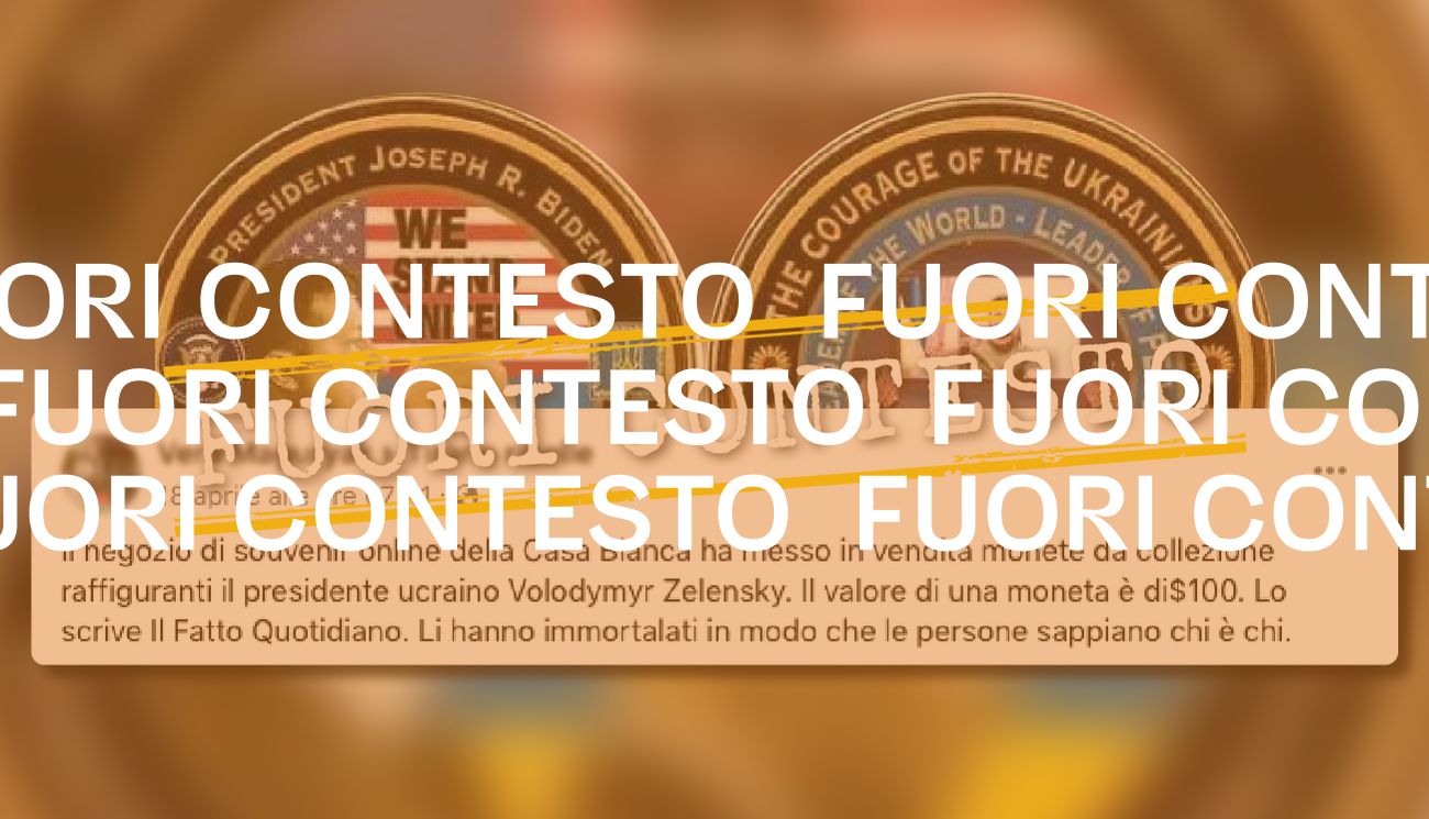 Il 18 aprile su Facebook è stata pubblicata un’immagine che mostra due monete con all’interno delle immagini che mostrano il presidente ucraino Volodymyr Zelensky e quello statunitense Joe Biden. La foto è accompagnata da un commento, scritto da chi ha pubblicato il post su Facebook, in cui si afferma che «il negozio di souvenir online della Casa Bianca» avrebbe messo in vendita, per un valore di 100 dollari, «monete da collezione raffiguranti il presidente ucraino Volodymyr Zelensky».