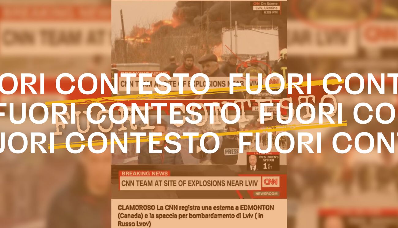 L’immagine mostra anche un vigile del fuoco ritratto di spalle, che indossa una divisa con la scritta «Edmonton». Il post contiene anche uno spezzone del servizio da cui è tratta l’immagine e un testo in cui si legge: «CLAMOROSO La CNN registra una esterna a EDMONTON (Canada) e la spaccia per bombardamento di Lviv ( in Russo Lvov)».