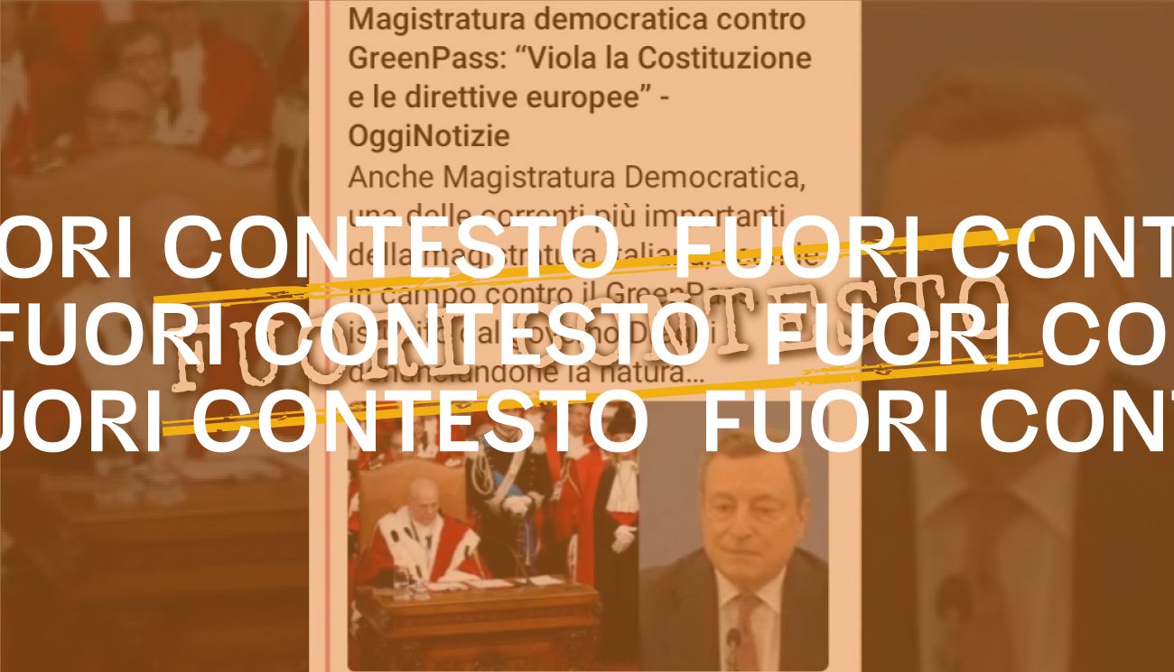 Il 30 settembre 2021 è stato pubblicato un tweet contenente lo screenshot di un articolo pubblicato il 25 settembre dal sito web Oggi Notizie e intitolato “Magistratura democratica contro GreenPass: ‘Viola la Costituzione e le direttive europee’”.