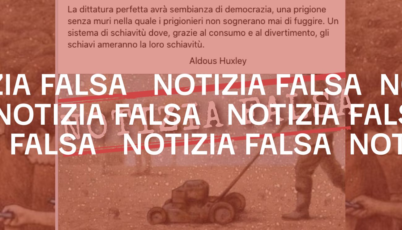Il 2 gennaio 2021 su Facebook è stato pubblicato un post contenente una presunta citazione dello scrittore britannico Aldous Huxley, morto nel 1963. L’autore del noto romanzo di fantascienza “Il mondo nuovo” avrebbe scritto: «La dittatura perfetta avrà sembianza di democrazia, una prigione senza muri nella quale i prigionieri non sognerano [sic] mai di fuggire. Un sistema di schiavitù dove, grazie al consumo e al divertimento, gli schiavi ameranno la loro schiavitù».