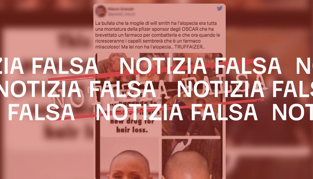 Le immagini sono accompagnate da un testo, scritto dall’autore del tweet, che recita: «La bufala che la moglie di will smith ha l’alopecia era tutta una montatura della pfizer sponsor degli OSCAR che ha brevettato un farmaco per combatterla e che ora quando le ricresceranno i capelli sembrerà che è un farmaco miracoloso! Ma lei non ha l’alopecia.. TRUFFAIZER..».