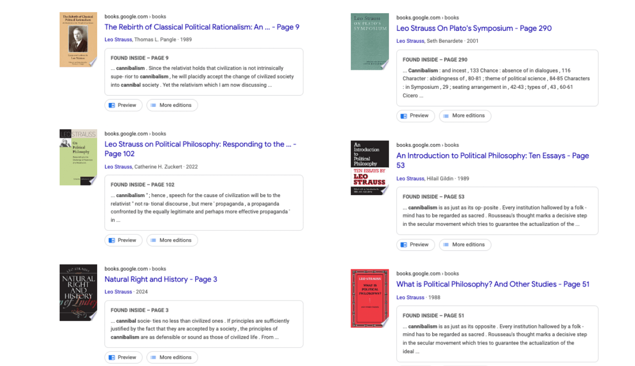 Ad esempio, nel libro Natural Right and History, Strauss scriveva (pagina 229 di questo documento) che «Tutte le società hanno i propri ideali, quelle cannibali non meno di quelle civilizzate. Se i principi sono sufficientemente giustificati dal fatto di essere accettati da una società, i principi del cannibalismo sono difendibili e validi quanto quelli della vita civilizzata. Da questo punto di vista, nulla, tranne l’abitudine ottusa e stantia, potrebbe impedirci di accettare placidamente un cambiamento in direzione del cannibalismo».