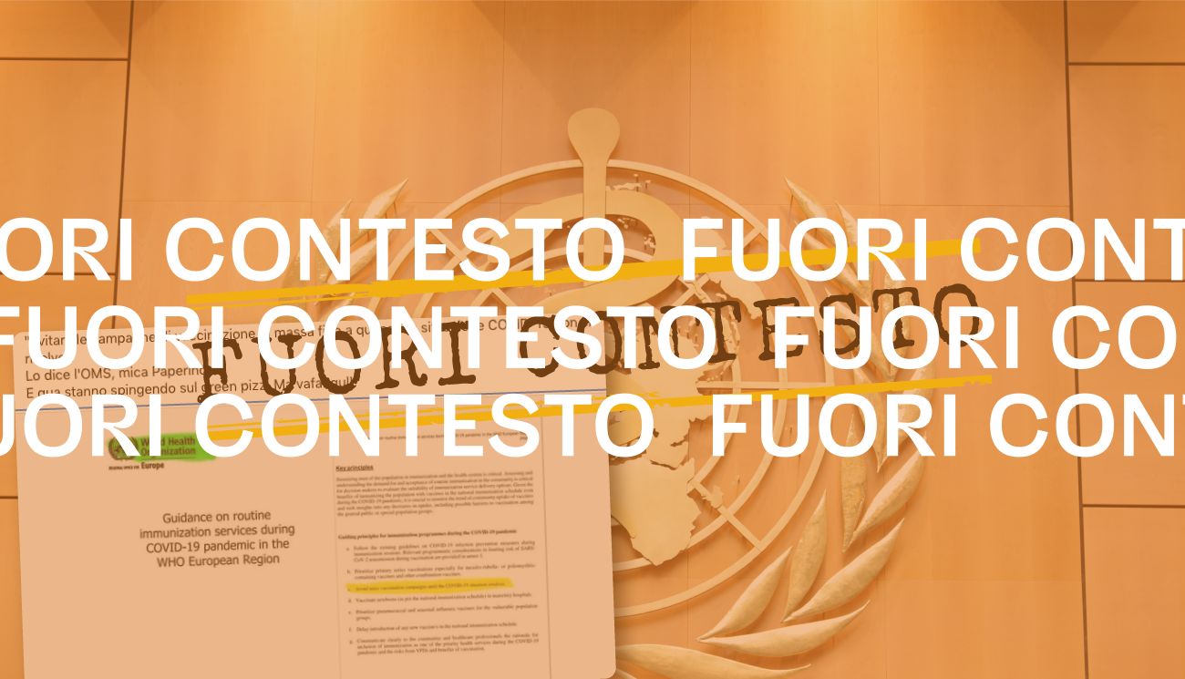 Il 20 luglio 2021 su Facebook è stato pubblicato un post contenente lo screenshot di un documento dell’Organizzazione mondiale della sanità intitolato “Guidance on routine immunization services during COVID-19 pandemic in the WHO European Region” (in italiano, “Linee guida sui servizi di immunizzazione di routine durante la pandemia di COVID-19 nella regione europea dell’Oms”), nel quale è stato evidenziato il seguente passaggio: «Evitare le campagne di vaccinazione di massa fino a quando la situazione COVID-19 non si risolve».