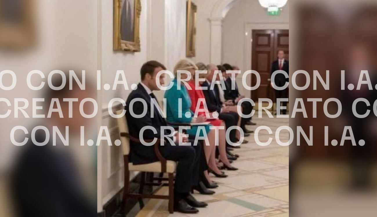 L’ultima proposta di Macron contro la disinformazione ha generato un bel po’ di disinformazione - Questa foto dei leader europei a capo chino in attesa alla Casa Bianca è falsaQuesta foto dei leader europei a capo chino in attesa alla Casa Bianca è falsa