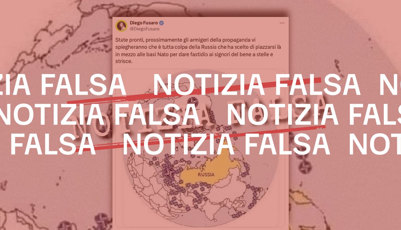 Il 28 marzo 2024 è stato pubblicato su Facebook lo screenshot di un post diffuso su X da Diego Fusaro, filosofo e opinionista televisivo. Nel post si vede la foto di un mappamondo costellato da tanti tondi con dentro il disegno della bandiera della Nato, tutti posizionati intorno al territorio della Russia. L’immagine è accompagnata da questo commento, scritto da Fusaro: «State pronti, prossimamente gli armigeri della propaganda vi spiegheranno che è tutta colpa della Russia che ha scelto di piazzarsi là in mezzo alle basi Nato per dare fastidio ai signori del bene a stelle e strisce».