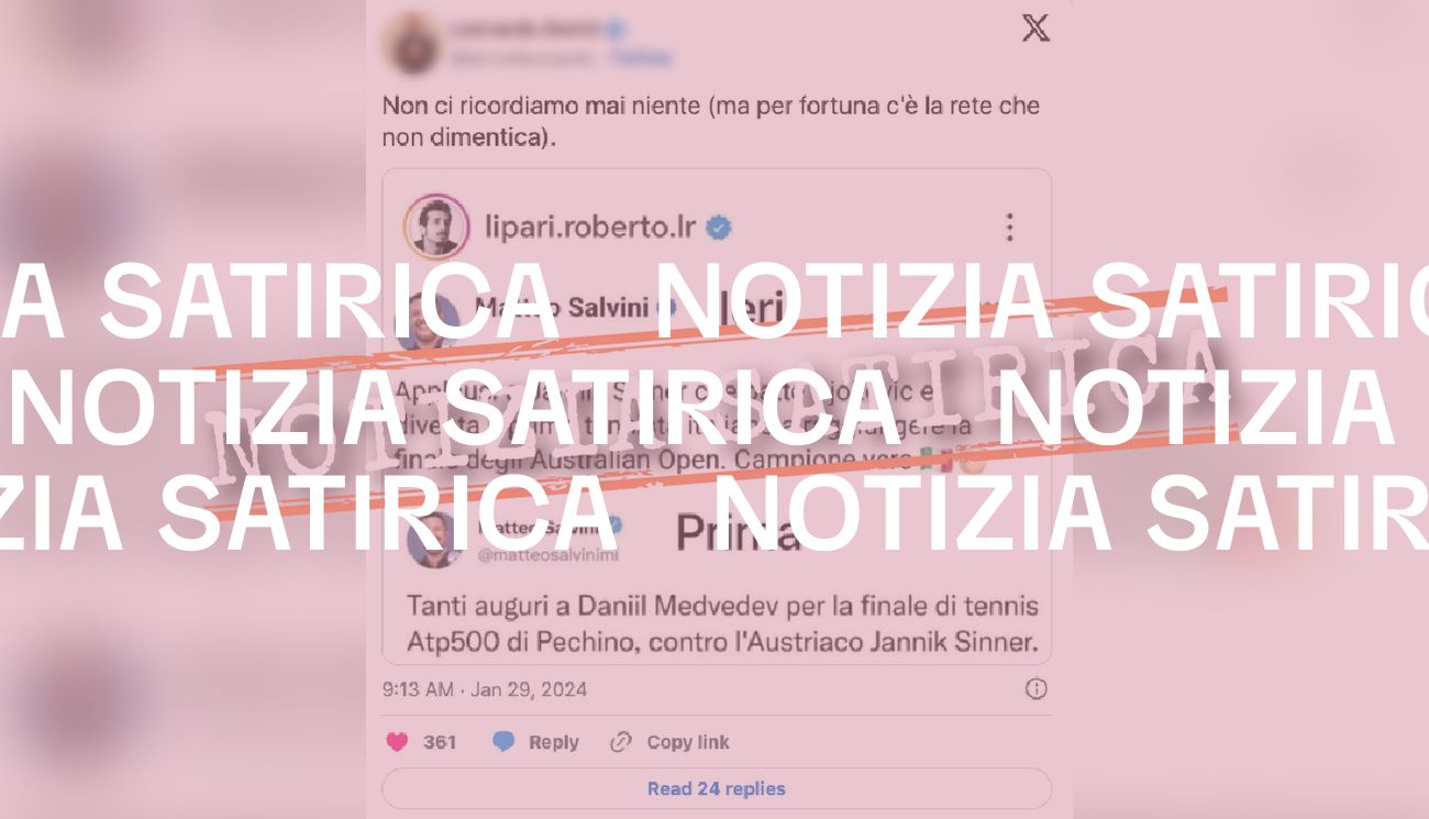 Il 29 gennaio 2024 è stata pubblicata su X l’immagine di un post Instagram del giorno precedente condivisa dall’account del comico Roberto Lipari, contenente due presunti tweet di Matteo Salvini. Nel primo, vicino al quale si legge la scritta in sovraimpressione «Ieri», il ministro delle Infrastrutture e dei Trasporti avrebbe scritto «Applausi a Jannik Sinner che batte Djokovic e diventa il primo tennista italiano a raggiungere la finale degli Australian Open. Campione vero». Nel secondo presunto post, accompagnato in questo caso dalla dicitura «Prima», Salvini avrebbe dichiarato «Tanti auguri a Daniil Medvedev per la finale di tennis Atp500 di Pechino, contro l’Austriaco Jannik Sinner».