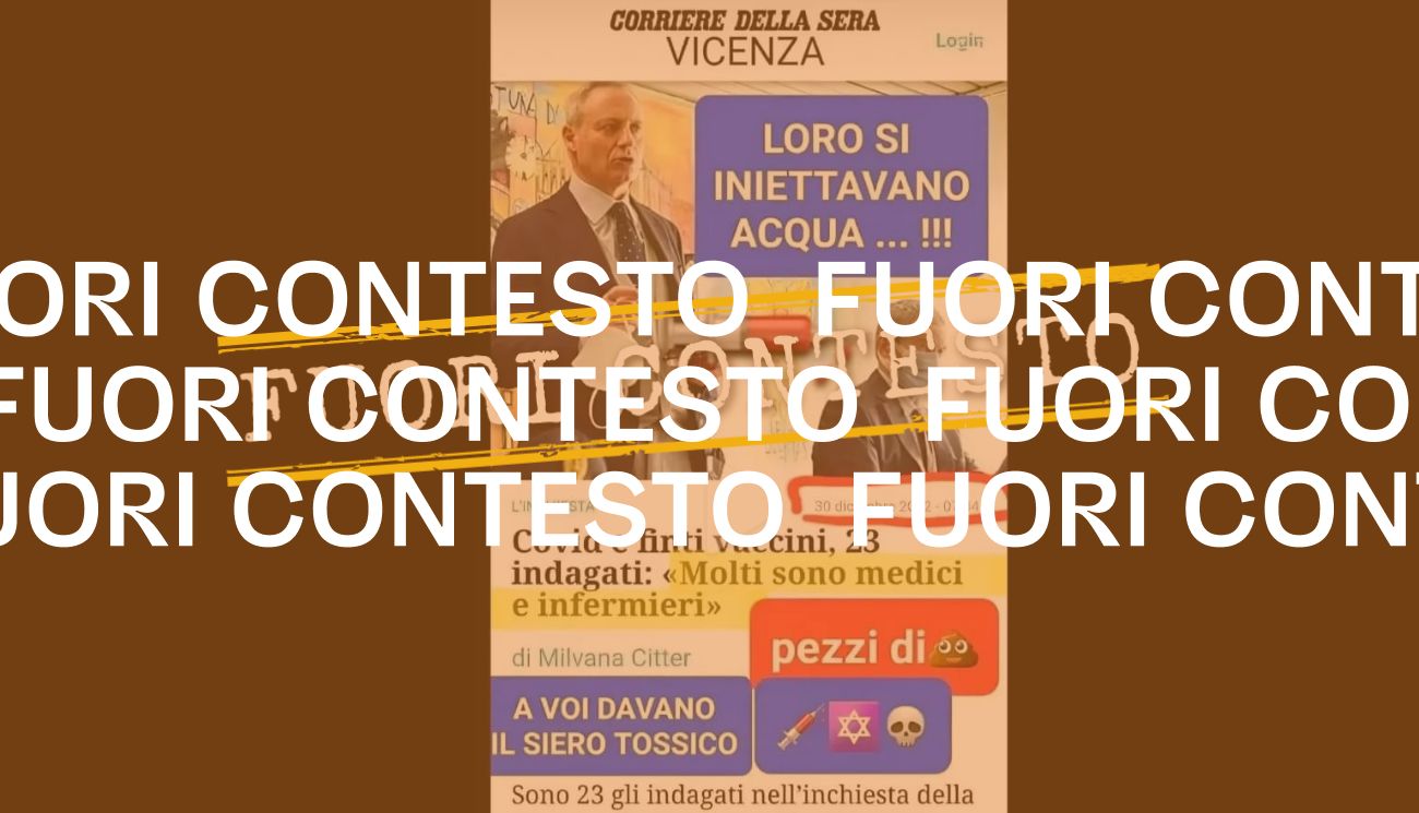 Il 14 ottobre 2024 è stato pubblicato su X lo screenshot di un articolo dal titolo “Covid e finti vaccini, 23 indagati: «molti sono medici e infermieri». In sovraimpressione allo screenshot si legge «loro si iniettavano acqua», e ancora «a voi davano il siero tossico».