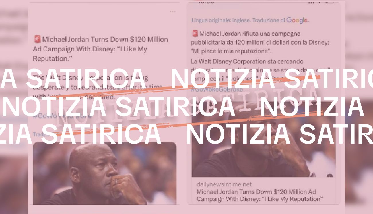 Il 10 aprile 2023 sono stati pubblicati su Facebook due screenshot che mostrano un tweet in inglese e la sua traduzione in italiano. Nel tweet in questione si legge una presunta notizia su Michael Jordan. L’ex campione statunitense di pallacanestro avrebbe rifiutato «una campagna pubblicitaria da 120 milioni di dollari con la Disney», spiegando di averlo fatto perché «Mi piace la mia reputazione».
