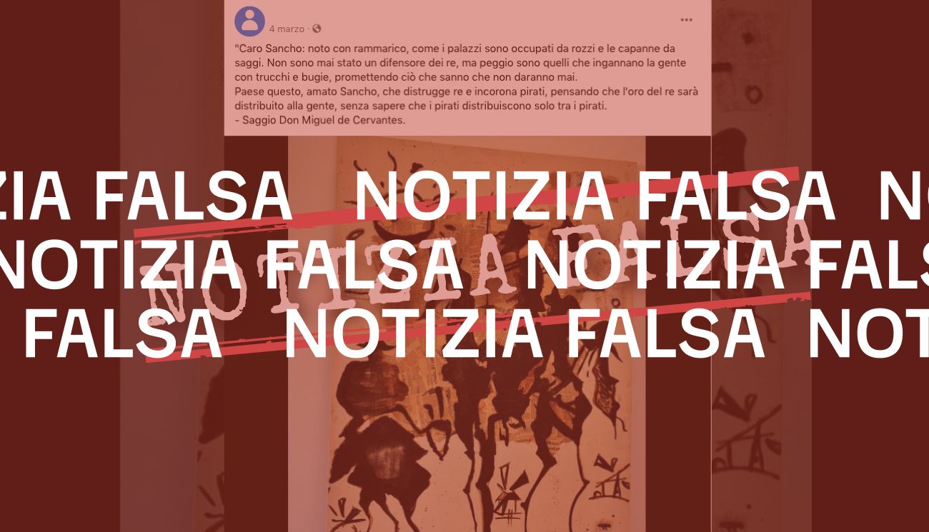 Negli scorsi mesi su Facebook è stato pubblicato un post in cui si sostiene che lo scrittore spagnolo Miguel de Cervantes, vissuto tra il XVI e il XVII secolo e noto soprattutto per aver redatto il romanzo Don Chisciotte della Mancia, avrebbe scritto: «Caro Sancho: noto con rammarico, come i palazzi sono occupati da rozzi e le capanne da saggi. Non sono mai stato un difensore dei re, ma peggio sono quelli che ingannano la gente con trucchi e bugie, promettendo ciò che sanno che non daranno mai. Paese questo, amato Sancho, che distrugge re e incorona pirati, pensando che l’oro del re sarà distribuito alla gente, senza sapere che i pirati distribuiscono solo tra i pirati».