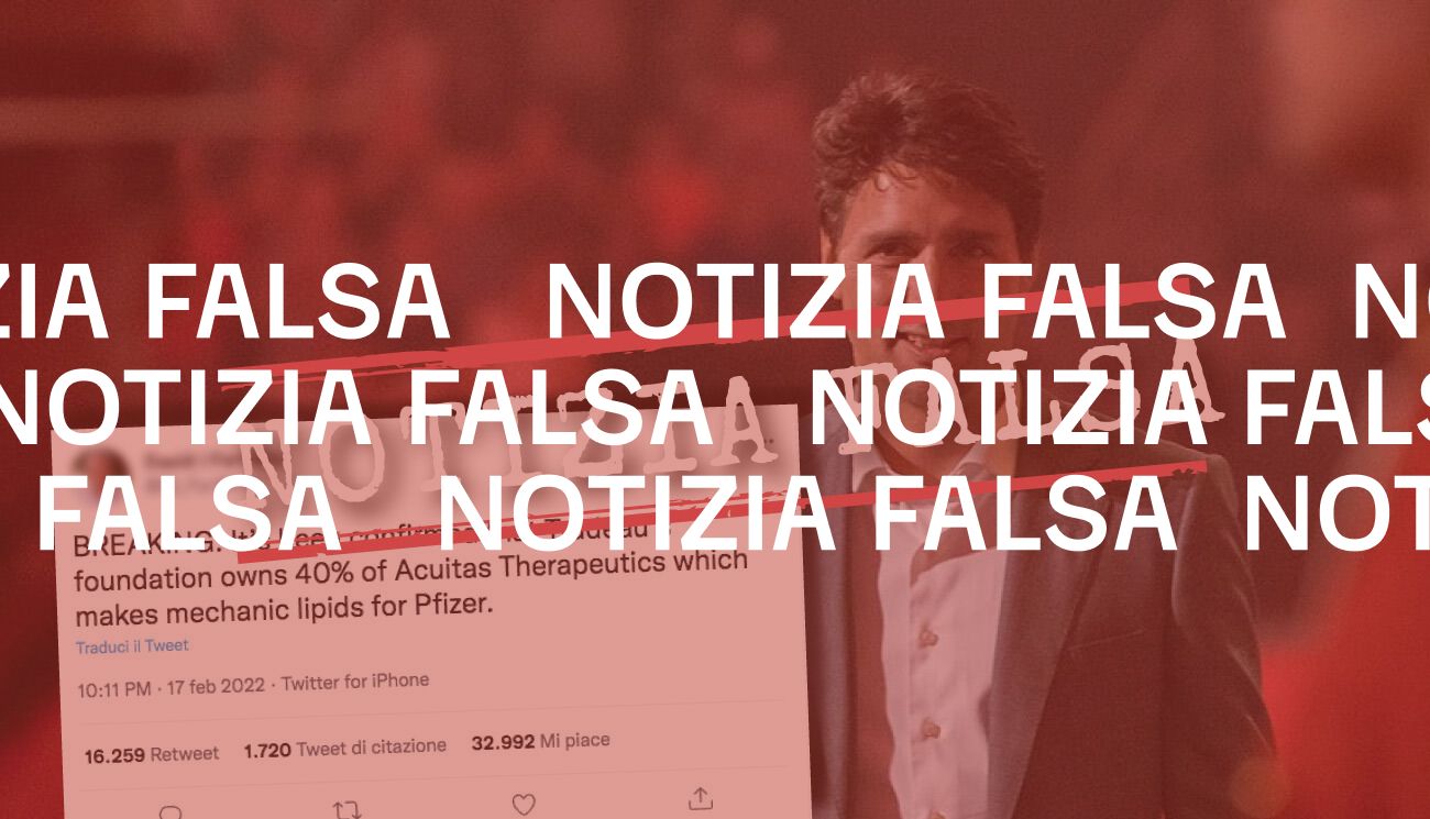 Il 21 febbraio 2022 su Facebook è stato pubblicato un post in cui si afferma che sarebbe stato «confermato che la fondazione di Trudeau possiede il 40% di Acuitas Therapeutics», un’azienda che produce lipidi per il vaccino anti-Covid prodotto da Pfizer e BioNTech.