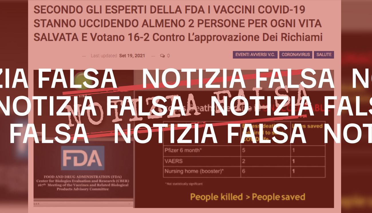 Il 20 settembre 2021 la redazione di Facta ha ricevuto tramite WhatsApp la richiesta di verificare un articolo, pubblicato il 19 settembre 2021 dal sito Database Italia e intitolato “Secondo gli esperti della Fda i vaccini Covid-19 stanno uccidendo almeno 2 persone per ogni vita salvata e votano 16-2 contro l’approvazione dei richiami”. Secondo l’articolo due esperti della Food and drug administration (Fda) – l’ente statunitense che si occupa di verificare efficacia e sicurezza dei farmaci – avrebbero dichiarato che i vaccini «stanno uccidendo almeno 2 persone per ogni 1 vita salvata». In seguito a tale testimonianza, l’Fda avrebbe poi votato contro «il consiglio all’agenzia di distribuire vaccini di richiamo a chiunque abbia più di 16 anni».