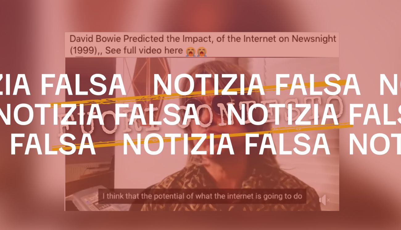 Al centro della nostra verifica è finito in particolare un filmato dal titolo David Bowie Predicts the Impact of the Internet on Newsnight (1999) che, secondo alcuni utenti, immortalerebbe lo spezzone di un’intervista rilasciata da Bowie nel 1999. Il video dura complessivamente 2 minuti e 15 secondi e mostra due uomini, un intervistato e un intervistatore, confrontarsi sul futuro di Internet. Bowie sembra avanzare, tra le altre cose, l’ipotesi che in futuro gli utenti spenderanno ore a guardare «video di cani e gatti adorabili», useranno le emoji, passeranno molto tempo sui social e ci saranno «gruppi di estrema destra che diffonderanno disinformazione sull’immigrazione».