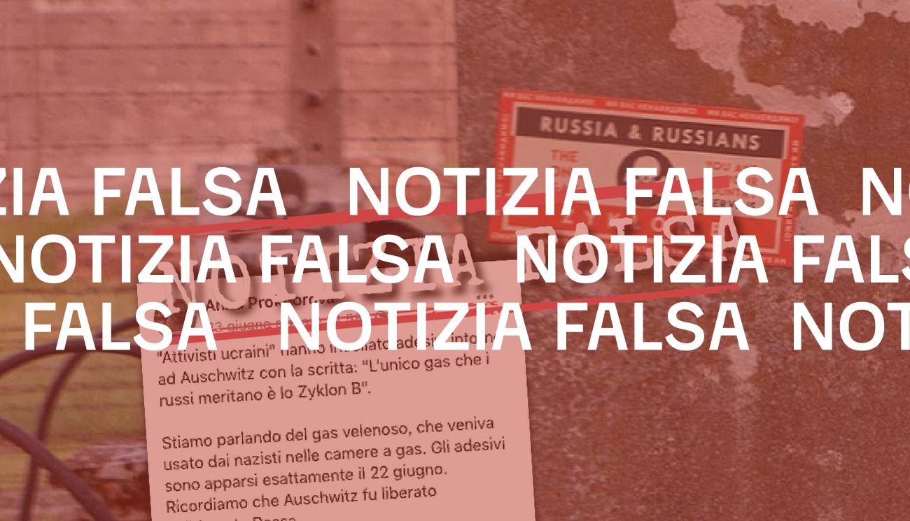 Il 24 giugno 2022 su Facebook è stata pubblicata un’immagine che mostra un adesivo rosso, bianco e nero con l’illustrazione di un teschio, su cui si legge la frase in lingua inglese: «Russia e russi, l’unico gas che voi e il vostro Paese meritate è lo Zyklon B». L’immagine è accompagnata da un commento, scritto dall’autore del post, che recita: «”Attivisti ucraini” hanno incollato adesivi intorno ad Auschwitz con la scritta: “L’unico gas che i russi meritano è lo Zyklon B”. Stiamo parlando del gas velenoso, che veniva usato dai nazisti nelle camere a gas. Gli adesivi sono apparsi esattamente il 22 giugno. Ricordiamo che Auschwitz fu liberato dall’Armata Rossa».
