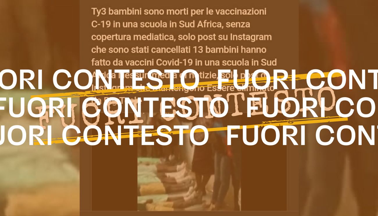 Il 27 ottobre 2021 su Facebook è stato pubblicato un post con un’immagine che mostra diversi corpi di persone disposti in fila per terra. La foto è accompagnata da un testo in cui si sostiene che la scena mostrerebbe 13 bambini deceduti dopo la somministrazione di un vaccino anti Covid-19 in una scuola in Sudafrica.