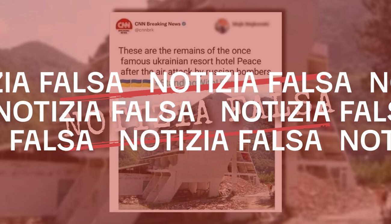 Il 21 marzo 2022 su Facebook è stato pubblicato uno screenshot di un presunto tweet della Cnn. Nel tweet l’emittente statunitense avrebbe riportato la notizia di un bombardamento russo sul «famoso resort hotel ucraino Peace». Il tweet include anche la foto di un edificio circondato da macerie e detriti.