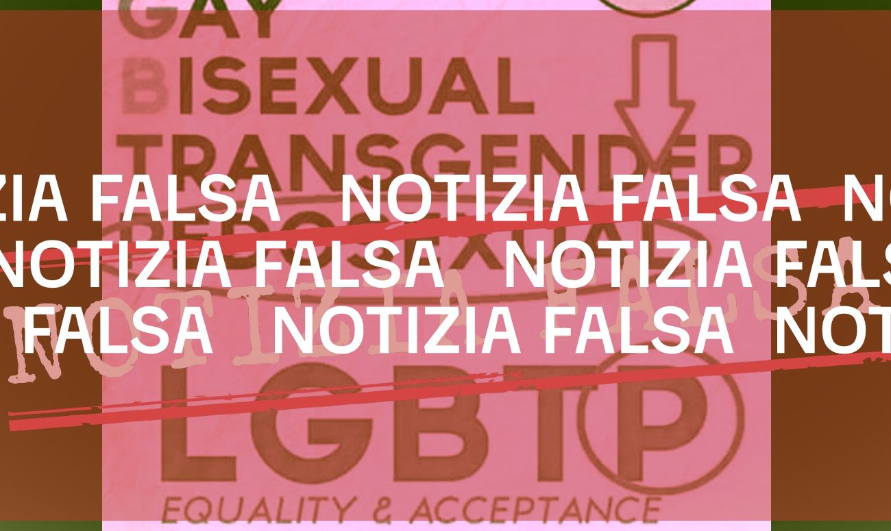 Il 6 febbraio 2021 su Facebook è stata pubblicata un’immagine in cui si legge «Lesbian Gay Bisexual Transgender Pedosexual. LGBTP. Per chi non credeva che questo fosse il loro fine ultimo». Secondo l’immagine oggetto della nostra verifica la comunità LGBT avrebbe aggiunto la lettera P alla sigla per includere anche la pedofilia.
