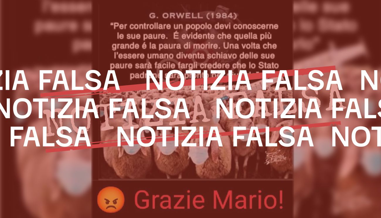 Il 1 dicembre 2021 su Facebook è stato pubblicato un post contenente una presunta citazione dello scrittore inglese George Orwell, deceduto nel 1950. Orwell avrebbe scritto nel suo libro 1984 «per controllare un popolo devi conoscerne le sue paure. È evidente che quella più grande è la paura di morire. Una volta che l’essere umano diventa schiavo delle sue paure sarà facile fargli credere che lo Stato padrone sarà pronto ad aiutarlo».