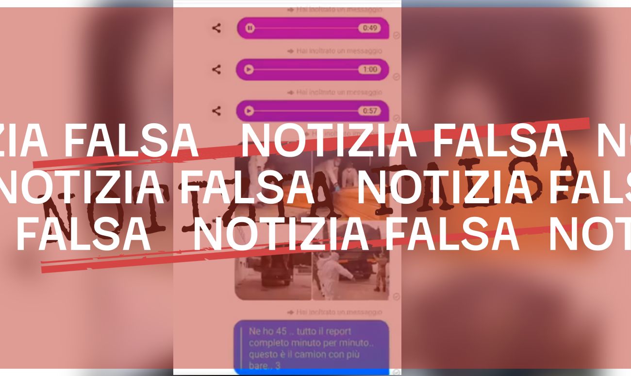 I messaggi vocali fanno riferimento alle bare del cimitero di Bergamo trasportate fuori città da un convoglio militare nella notte tra il 18 e il 19 marzo 2020, una delle immagini-simbolo della prima ondata di Covid-19 in Italia (ce n’eravamo già occupati in un precedente articolo). Nei messaggi vocali, una voce maschile spiega che «le bare vennero accumulate» dal comune di Bergamo per 26 giorni e che «i corpi all’interno andavano in putrefazione e hanno iniziato a colare fuori dalle bare». Per questo motivo, spiega l’uomo, le agenzie di pompe funebri avevano rifiutato di trasportare i corpi («A me poi la macchina chi me la paga? Devo rifare tutto l’interno della macchina», avrebbero sostenuto i titolari delle agenzie) e di conseguenza fu necessario affidarsi a veicoli militari.