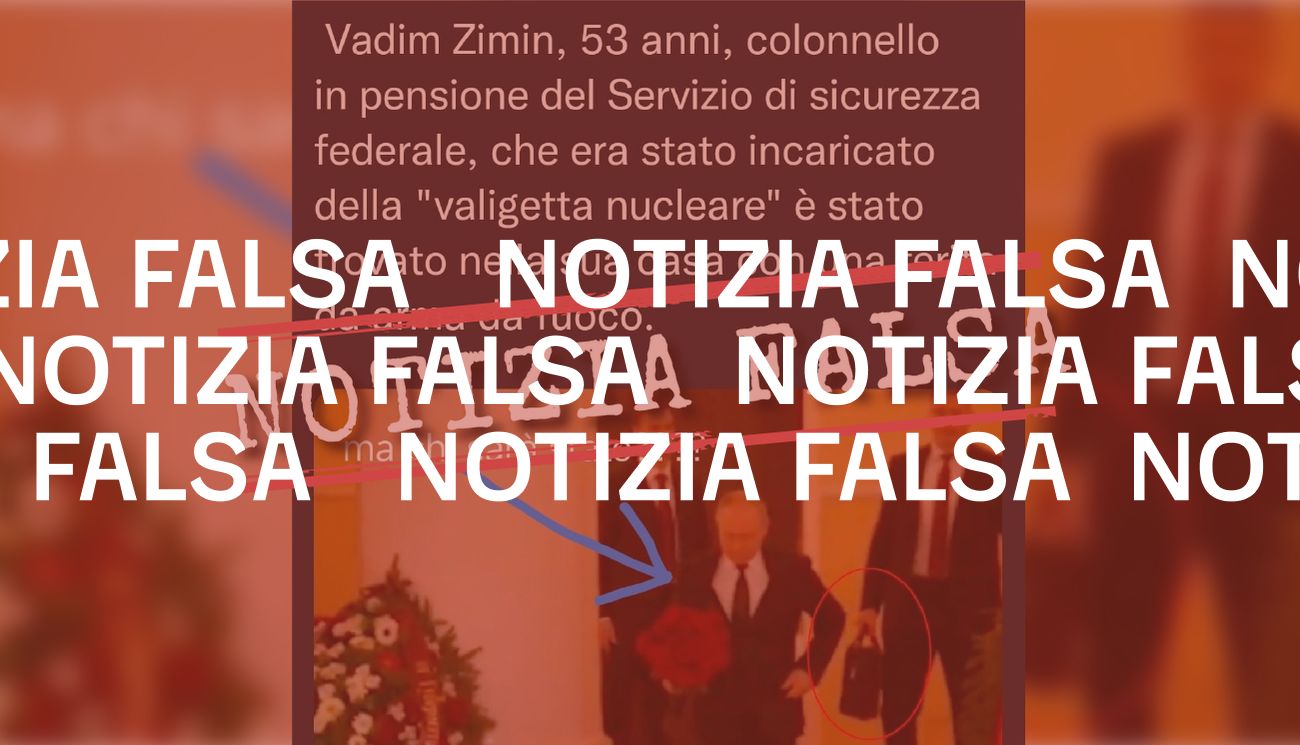 Il 24 giugno 2022 su Facebook è stato pubblicato uno screenshot contenente la foto di un uomo con una valigetta che cammina a pochi passi dal presidente russo Vladimir Putin, insieme a un testo in cui si legge: «Vadim Zimin, 53 anni, colonnello in pensione del Servizio di sicurezza federale, che era stato incaricato della “valigetta nucleare”, è stato trovato nella sua casa con una ferita da arma da fuoco. Ma chi sarà stato????».