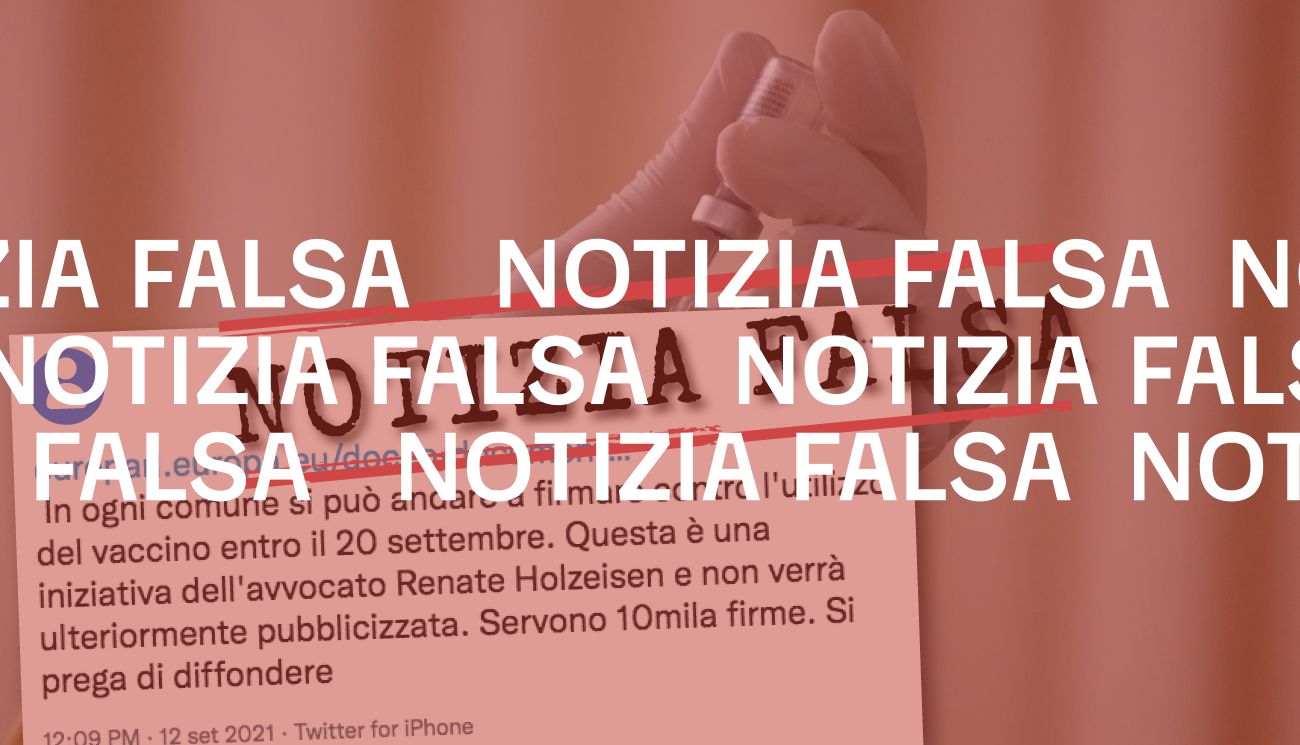 Il 10 settembre 2021 la redazione di Facta ha ricevuto via WhatsApp una segnalazione che chiedeva di verificare l’informazione, circolata sull’app di messaggistica istantanea, secondo cui i comuni italiani starebbero ospitando una raccolta firme «contro l’utilizzo del vaccino». Tale iniziativa sarebbe stata lanciata «dall’avvocato Renate Holzeisen» e punterebbe a raggiungere quota 10 mila firme entro il 20 settembre 2021.
