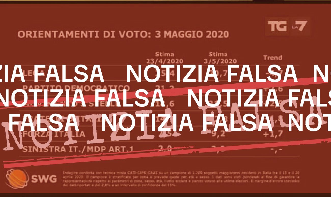 Il 3 maggio su Twitter è stata pubblicata un’immagine che mostrerebbe un sondaggio attribuito alla Swg sull’«orientamento di voto» degli italiani. Stando ai dati riportati, al 3 maggio 2020 la Lega sarebbe al 20,7 per cento, perdendo, rispetto alla rilevazione del 23 aprile scorso, quasi il 5 per cento e finendo in terza posizione tra le intenzioni di voto alle spalle del Partito democratico (23,9 per cento) e del Movimento 5 Stelle (21,5 per cento). L’immagine ha anche un diretto riferimento al TgLa7, di cui viene riportato il logo in alto a destra.