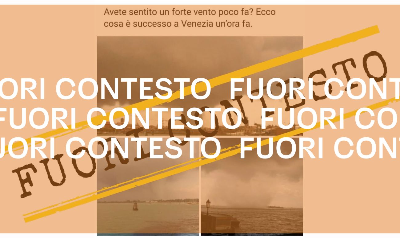 Nella giornata di martedì 14 aprile 2020 forti raffiche di vento (bora) hanno effettivamente colpito il Veneto (fonte: Arpa). Le foto riportate – che come conferma anche la testata locale La Voce di Venezia hanno ripreso a circolare attraverso WhatsApp proprio nelle ultime ore – immortalano sì la città lagunare ma riguardano fatti risalenti al 12 giugno 2012 (come è possibile verificare anche qui). In quell’occasione una violenta tromba d’aria si è abbattuta sulle isole di Certosa, Sant’Erasmo e Sant’Elena (Venezia). Si tratta quindi di immagini recentemente utilizzate fuori dal loro contesto originale.